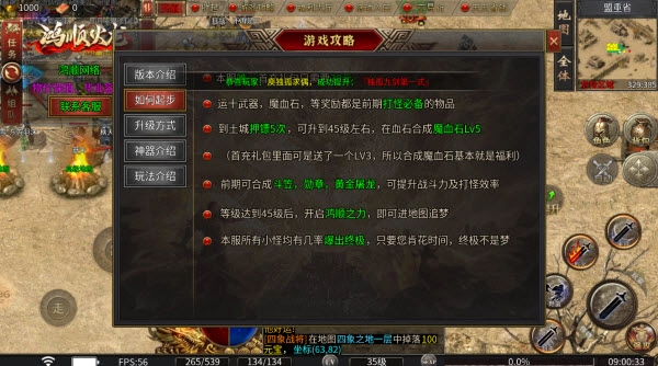 前期可以合成斗笠、勋章和黄金屠龙,这些装备能够提升战斗力和打怪效率;当等级达到45级后,开启鸿顺之力,就能进入地图追梦了。
