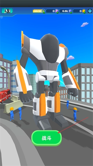 点击界面下方的战斗按钮,就能进入城市场景的战斗关卡。这时机甲处于待战状态,周围能看到建筑和角色,准备开启对战流程。