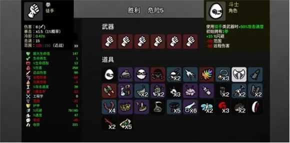 斗士职业的核心玩法如下:优先选择徒手战斗,徒手武器自带攻击速度加成;初始拥有15%的闪避率,建议将闪避属性堆至60%,此时敌人的攻击会频繁落空;武器方面直接用拳头即可,不仅获取成本低,输出能力也很可观。属性点分配以近战伤害、闪避率和最大生命值为主;回复手段推荐依靠树木相关机制——所有树木类道具都可以收集利用,或者也可以搭配生命窃取效果来提升续航。