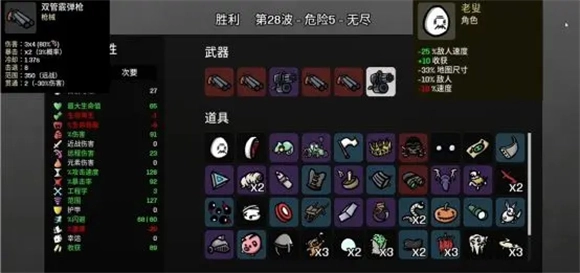 这个角色堪称多面手,能同时使用12把武器。不过每多拿一件武器,整体伤害就会降低5%,好在初始状态下有20%的伤害加成。要是选武器树枝的话,效果很特别:每持有一个树枝,就能增加10点伤害,当拿满12把树枝时,每一把都会额外提供110点伤害。 加点方面,优先考虑近战伤害、攻击速度和暴击率。前期得多加些收获属性,最大生命值也不能忽略,不然很容易被敌人秒杀。到了后期,这个角色的伤害会变得非常恐怖,面对大型精英怪和BOSS都能直接秒杀。不过应对小频率攻击时需要注意走位,适当增加攻击范围,手变长了会更好打。