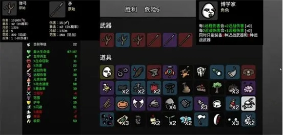 博学家是个双修定位的角色,属性成长上,每1点远程属性能额外加2点近战属性,每2点近战属性则能额外加1点远程属性;装备限制为最多带3种近战武器和3种远程武器。推荐搭配弹弓和矛,这俩能吃到原始羁绊的加成;属性点建议把近战伤害和远程伤害都点上,两边兼顾收益更划算。另外攻速、护甲、最大生命这些属性也得点,要是地图里树木多就建议买树木,树木少的话可以少点些生命窃取。