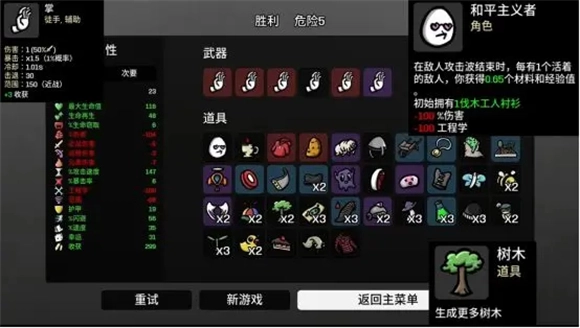 和平主义者:减100%伤害,没伤害,减100工程学,不能玩炮塔。只有不杀人,点防御属性,点生命生命再生,护甲,闪避。在敌人击波结束时,每活着一个敌人,获得0.6个材料和经验值,不杀人可获得材料和经验,武器用掌,击退不杀,且掌会给收获。道具有击退圈套要拿,因为主要是靠掌击退,点攻速,点生命窃取,肉就可以。