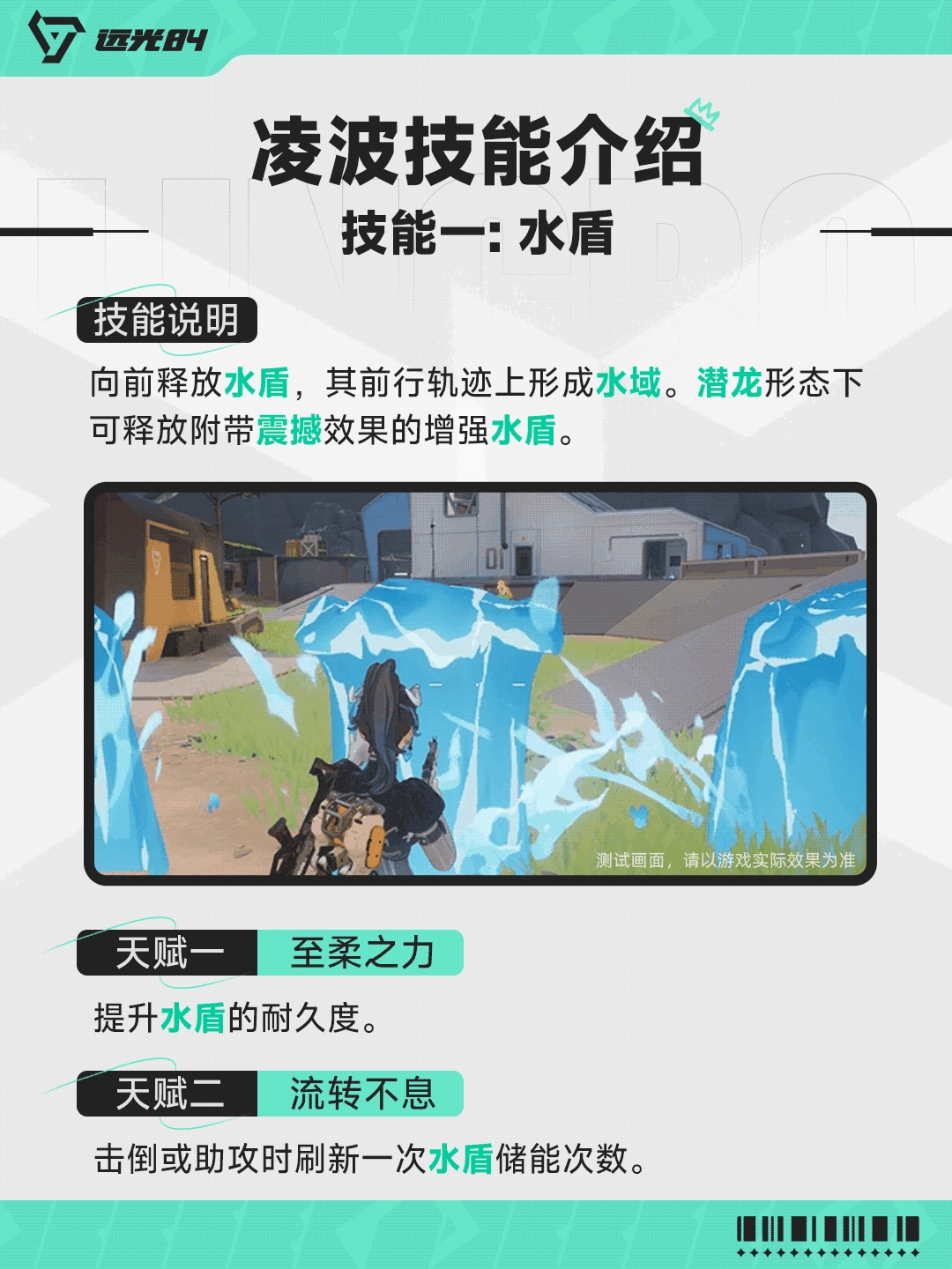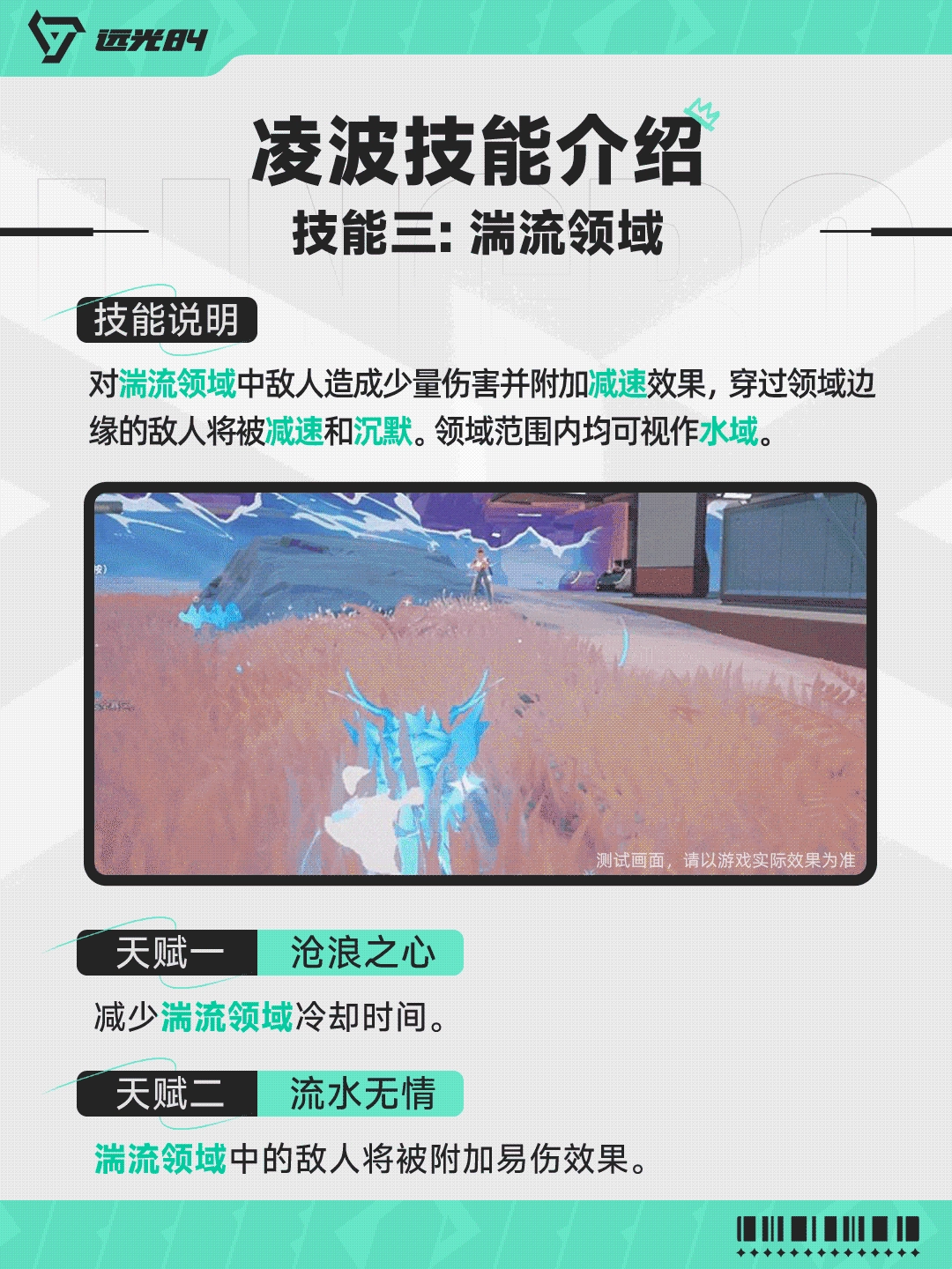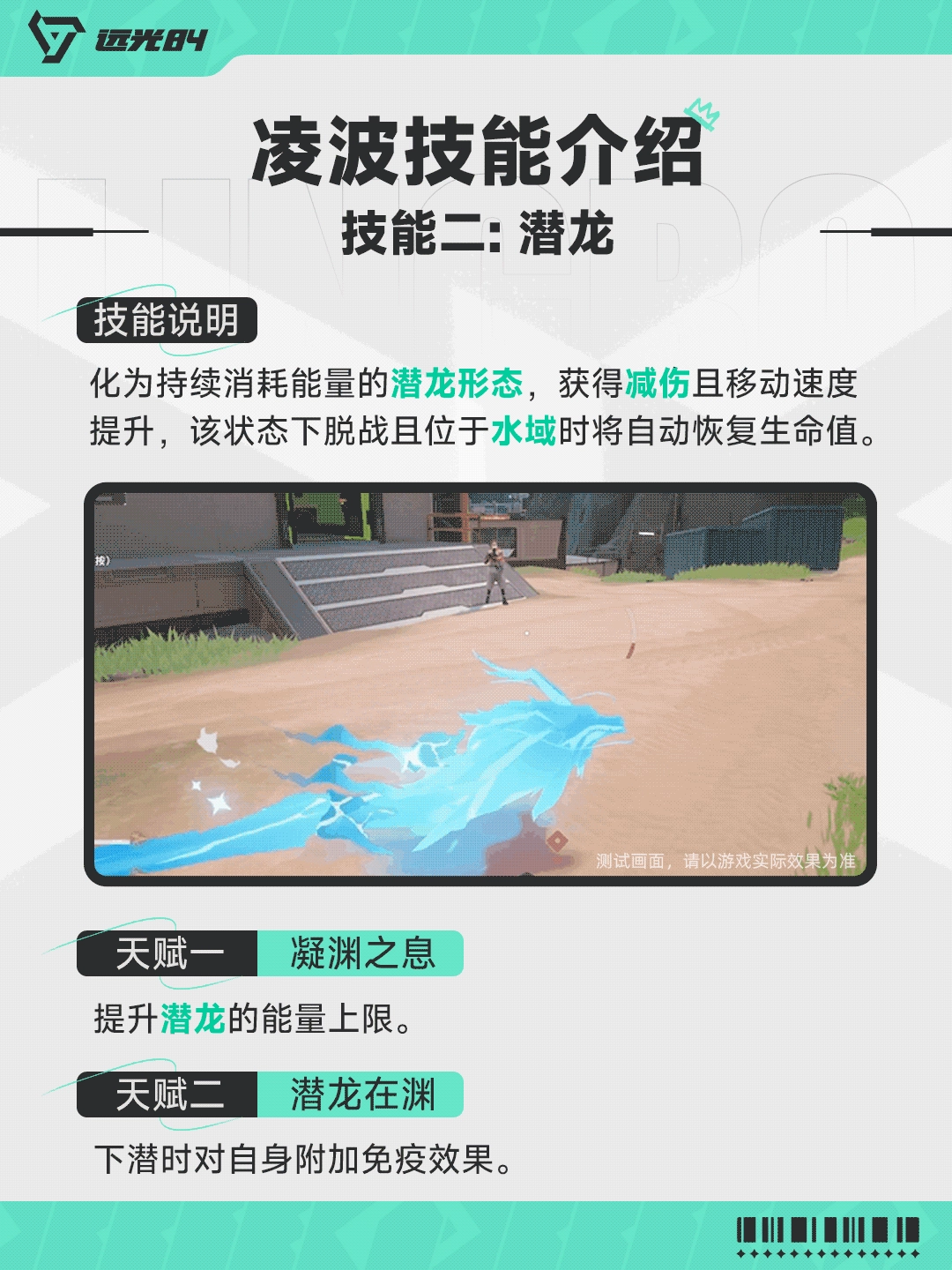 凌波在战场上属于游击定位,她可灵活施展水遁之术,营造水域环境,还能化身为【潜龙】来应对战场上的各种复杂局势。同时,她能够让敌方陷入减速、沉默等异常状态,并且可以恢复自身的生命值,堪称一位综合能力十分出众的游击手。