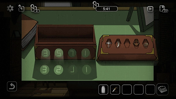 窗下的柜子饰品盒,需按照《末世》里的人物顺序,依次把【十字架】【狼牙】【宝剑吊坠】【戒指】【毒蛇饰品】放进凹槽中。完成后会得到(密码:5317),具体如图↓所示。另外,【宝剑吊坠】可以收回至物品栏。