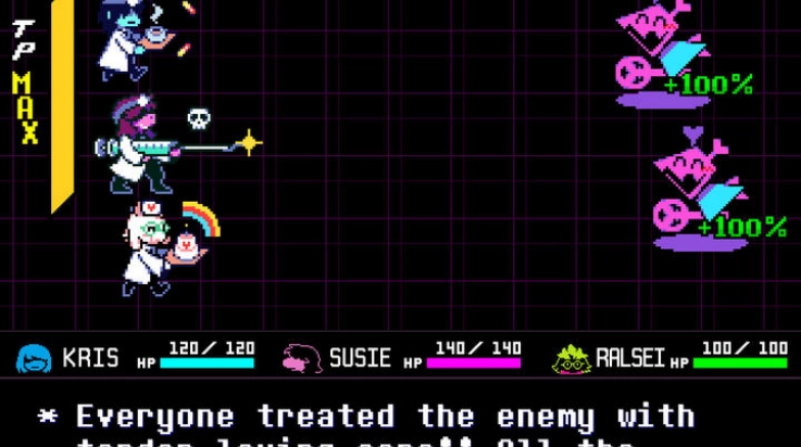 多角色策略选择:Kris、Susie、Ralsei 等角色都有各自专属的技能树,战斗时的搭配组合有着很高的自由度。