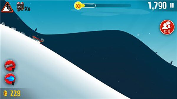 这里提到的加速对应的是界面中上方的速度条,其最高可达到x8的八倍速档位。需要说明的是,这并非让整个游戏的运行速度提升八倍,而是特指滑雪者的滑行时速得到增加,每秒前进的距离会显著变长。实现加速的途径不少:除了借助动物来获取速度加成外,完成一次完整的后空翻动作也能提升一级速度——这种操作通常在陡坡区域进行,因为那里滞空时间相对较长,而在成功着陆的瞬间,会有黄色火花特效出现,同时为你完成加速效果的触发。
