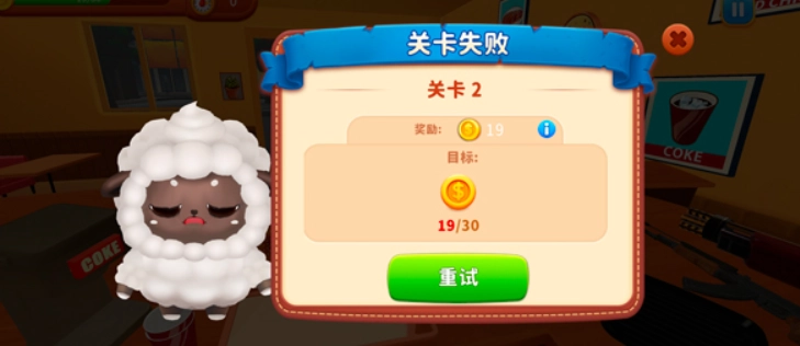 4、若时间结束时仍未达到要求,将显示关卡失败,此时点击“重试”即可重新挑战。