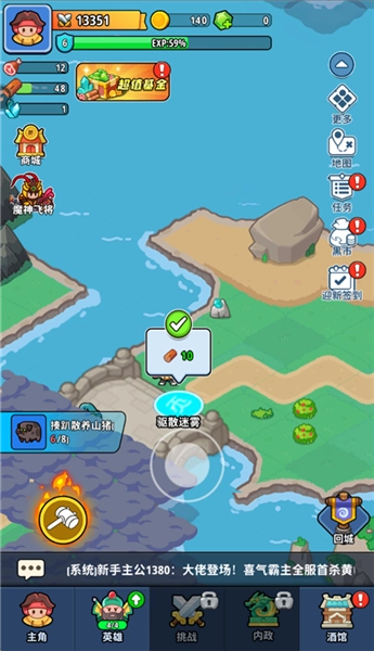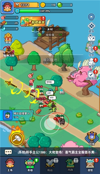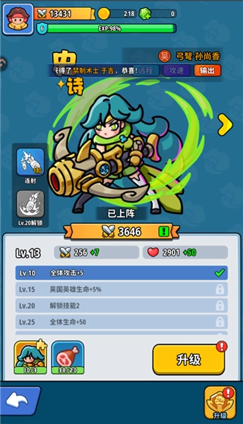 A:要紧跟主线任务推进,把重点放在提升上阵英雄的等级上,还要多升级训练营的天赋来增加可上阵的英雄数量。当肉块比较充足时,给其他英雄升级也能提升全体英雄的属性。打boss会掉落装备,经常更换更高级的装备同样可以提升整体战力。