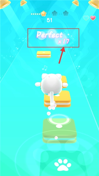 2. 控制小猫在蓝色平台上移动,把握好音乐节拍,力求得到【Perfect】的评价。