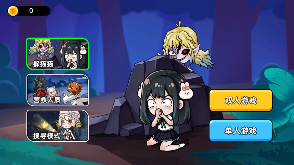 恐怖冒险躲猫猫双人版是一款趣味十足的恐怖题材躲猫猫游戏,玩法和《黎明杀机》《第五人格》这类恐怖非对称对抗游戏相似。在这个2D卡通风格的游戏里,你能选择不同玩法展开探索,自由穿梭于广阔的游戏世界,开启一段神秘又诡谲的冒险之旅。你可以借助各种不同的环境伪装自己,巧妙躲避敌人的追击;游戏还包含丰富有趣的冒险玩法,通过双人联机模式,你能和好友一同参与各类冒险挑战。此外,游戏设有躲猫猫、救人质、搜索三种模式,让你在紧张刺激、心惊肉跳的过程中,体验到多样且充满趣味的冒险,快来一起探索吧!