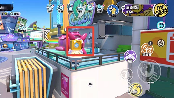 首先我们得获取踮脚箱这个道具,要是一时没找到也不用着急,在周围找找道具刷新点,很快就能拿到手。拿到道具后,前往盲盒商店和旁边蓝色商店的角落处,把踮脚箱一块一块堆叠起来,接着跳到蓝色商店的顶部平台,再从平台跳到房子的后方,从这往后,剩下的就都是还没开发的区域了。