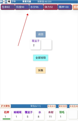 4、玩家收集物资时需留意自身体力状况,体力不足时切勿进行狩猎,否则极易被击败,一旦体力耗尽就必须返回住处补充体力。