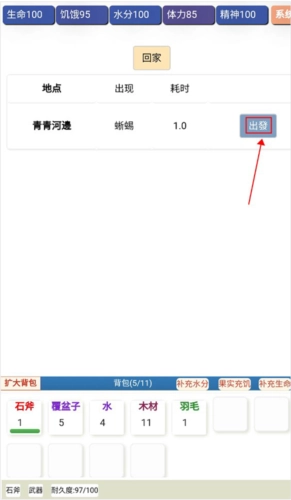 1、玩家进入游戏后,可点击“出门”按钮,开启探索并收集各类物资。