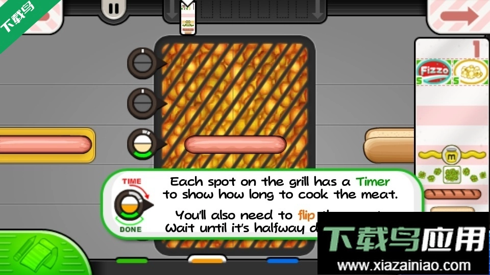 老爹热狗店是一款卡通风格的模拟经营游戏。玩家化身为热狗店店主,核心工作是制作可口的热狗并满足顾客要求,从而逐步扩展自己的生意,实现从单一摊位到品牌连锁的梦想。游戏采用色彩明快的2D卡通画面,角色造型活泼,整体氛围轻松愉快。你需要将热狗肠放在烤架上细心烤制,时刻留意火候与时间,防止烤焦。烤制时观察指针进度,当一侧变为橙色即可翻面。烤好的香肠需放入面包中,并依据顾客订单添加诸如酱料、芝士、番茄酱等多种配料。这些配料选择多样,你可以自由搭配,创造出独一无二的热狗口味。除了主角热狗,游戏还要求你制作薯条、爆米花等小吃,并为顾客提供饮料。顾客会对成品的完成度与外观进行评价并支付费用,评分越高收入越多;如果食物做得糟糕,甚至可能被扣钱。