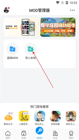 2、找到并点击“导入本地”选项,上传自己的本地MOD资源;