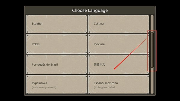 1、第一次进入游戏时,我们需要手动选择语言,向下滑动找到“繁体中文”并点击,就能完成语言切换了。