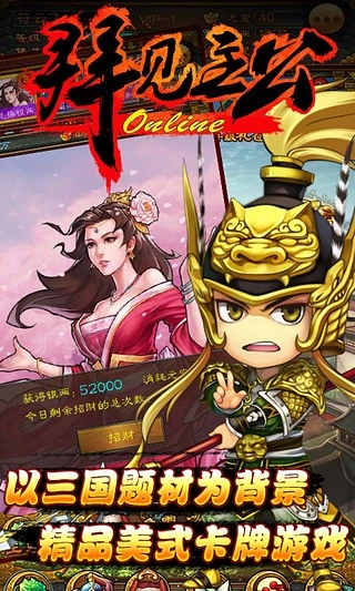 拜见主公是一款以三国历史为背景,精心打造的写实卡漫风格策略类手机游戏。游戏采用高清画质,将三国历史中的名将、战役、剧情等元素完美融合,为玩家呈现出一个真实而又富有创意的三国世界。在游戏中,玩家将扮演一位主公,通过招募名将、培养军队、征战沙场,最终实现一统三国的伟业。