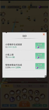 培养的优先级可以放在升阶之后,也就是说不用特意把商店看广告获得的收益用来提升培养,只要用正常打怪掉落的钻石来点培养就足够了。通常小怪有概率掉落2钻石,boss则必定掉落10钻石。我没有仔细计算过,但大概一天能掉落20K左右的钻石。“小怪上限”这个选项不用点,因为小怪都是被秒杀的状态。“小怪每秒生成速度”和“怪物掉落金币加成”可以一起加点,不过“生成速度”带来的实际收益要比“金币加成”更高一些。