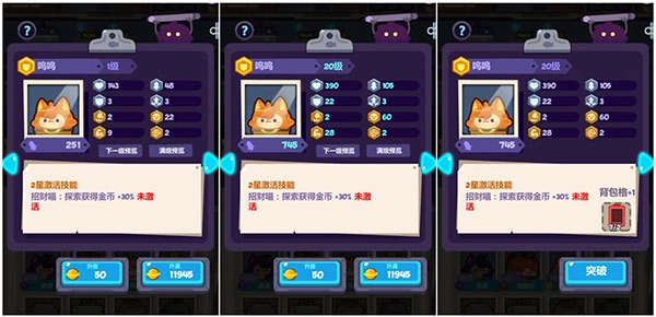 长按不同等级的预览选项,即可查看该等级对应的属性数值。当角色等级达到20级和40级时,需使用对应等级的电池进行突破,突破后才能继续提升等级。突破后的角色不仅会增加探索时的背包容量,自身的技能也会随之解锁。装备的提升同样能增强角色实力,当装备达到特定等级后,还会解锁专属技能,为角色带来显著的战力提升。在资源有限的情况下,建议均衡升级各个角色,因为角色等级提升的资源消耗是逐步增加的。前期培养蓝色和紫色品质的角色,也能快速提升整个队伍的战斗力。此外,如果在某个特定关卡遇到瓶颈,可以优先升级对该关卡Boss有克制效果的角色来尝试突破。