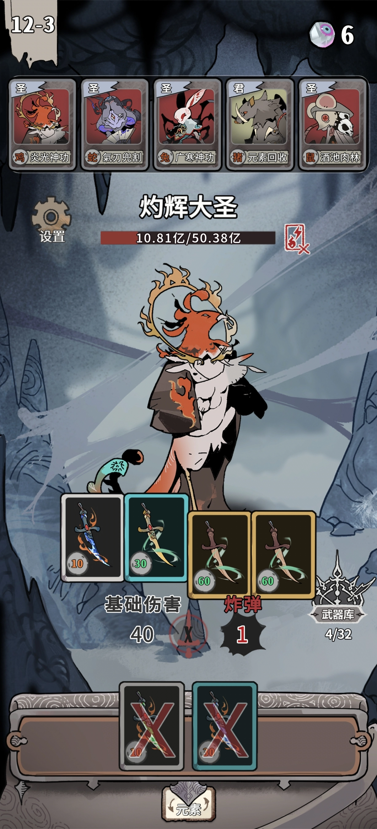 通关思路:把太刀和匕首之外的所有卡牌都清理掉,优先消除属性相同的卡牌,最后将注意力集中在最强属性上。