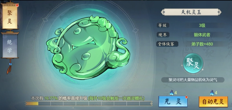 这枚蕴含玄机的玉佩中藏着不少早已湮没于岁月的顶尖武学秘籍。门派执掌者能借助特殊令牌,将行囊里的各式装备、突破所需的材料等物品进行转化,以此获取对应的灵力来为玉佩注入能量。每次注入灵力时,都有一定几率让玉佩直接提升品阶;而当灵力积累的进度条完全填满时,玉佩的品阶则必定会得到提升。玉佩每提升十个品阶,便会引来器灵的馈赠,开启这份馈赠就能得到那些顶尖武学的碎片。
