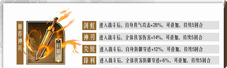 剑虹:进入战斗状态后,自身的真气攻击会提升28%,该效果能够叠加,持续时间为5个回合。
