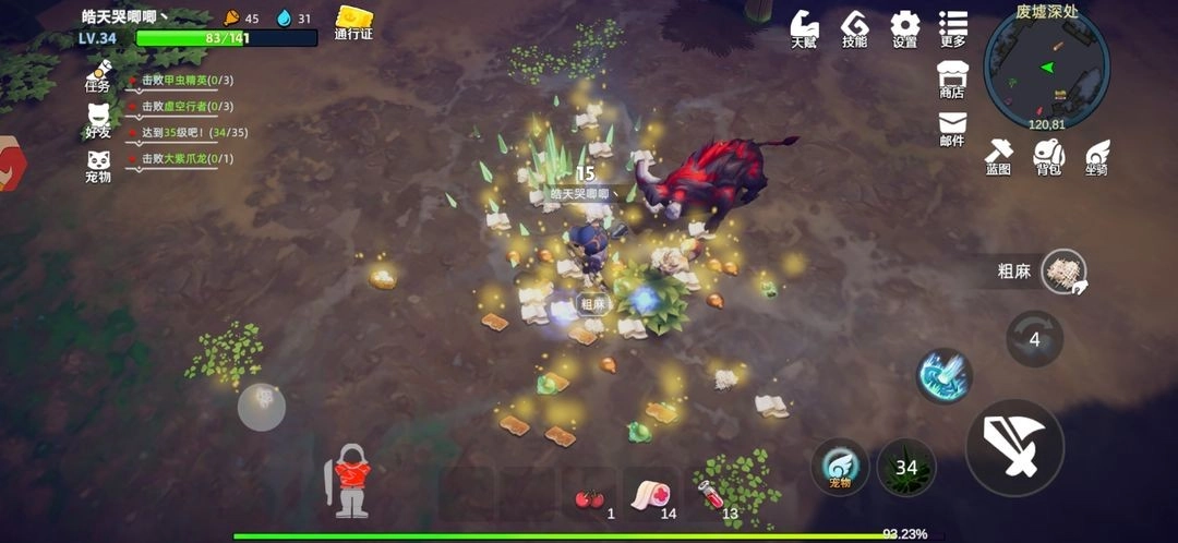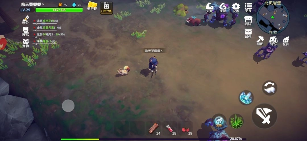 冬青森林里精怪数量不少,还有“头狼出没”的提示!宝箱里能开出目前很紧缺的铁丝,不过铁木只有零星几颗。建议等25级更新完装备再过来探索,20级的话不太推荐——不仅打怪伤害低得像刮痧,还得消耗大量恢复道具。