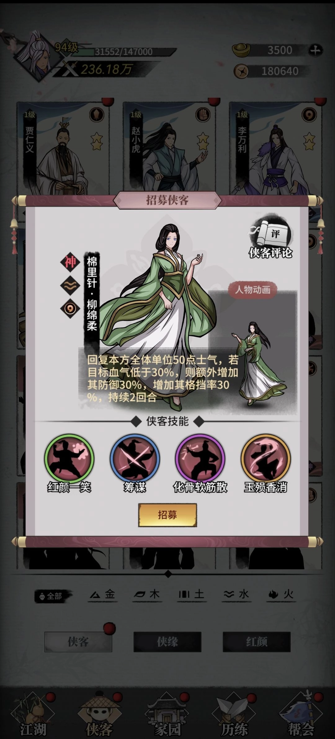 柳棉柔堪称辅助中的佼佼者,她能为全队拉条提升50点士气,战斗开场还会给己方3名侠客加持30%的攻击与防御增益。不仅如此,她的普通攻击能削减敌方50点士气,这一特性有效加快了队伍大招的释放节奏,进而显著增强了整体输出能力。值得一提的是,柳棉柔的升星难度不高,通过帮派积分每天就能兑换40个她的侠客信物呢。