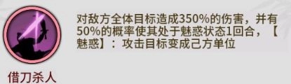 强烈推荐重点培养这位侠客,她的战略价值极高,建议优先安排在前排确保先手出击——不仅能打出全体高额伤害,更有50%概率触发魅惑效果,让被魅惑的敌方目标转而攻击己方单位(且魅惑状态下的敌人仍会释放技能攻击己方)。这个技能堪称逆转战局的关键,能轻松实现反败为胜,将敌方力量化为己用,操作空间拉满。若将她升至高星,搭配阴连山的毒系装备更能形成相辅相成的效果,是一位永远不会过时的版本天花板级英雄。
