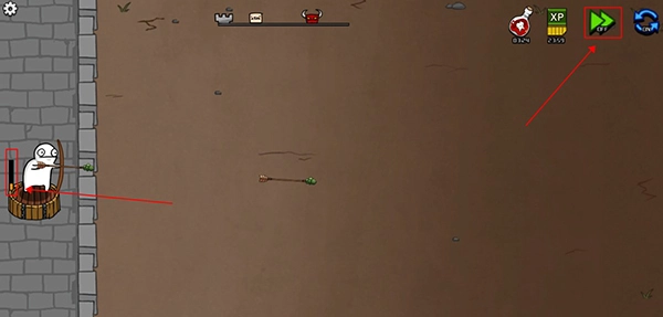 进入关卡后,游戏角色会自动发射弓箭攻击敌人,攻击过程中会积攒怒气值,怒气值满格后能提升角色的攻击速度;玩家还可以点击右上角的绿色加速按钮来加快游戏进程。