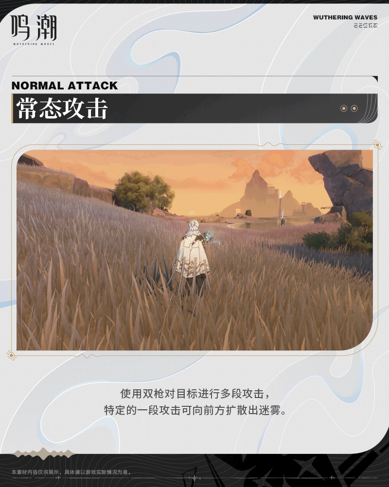 使用双枪对目标展开多段攻击,其中某一段特定攻击能够向前方扩散出迷雾。