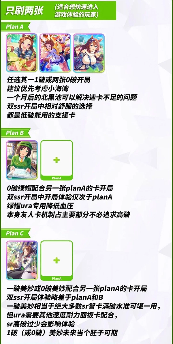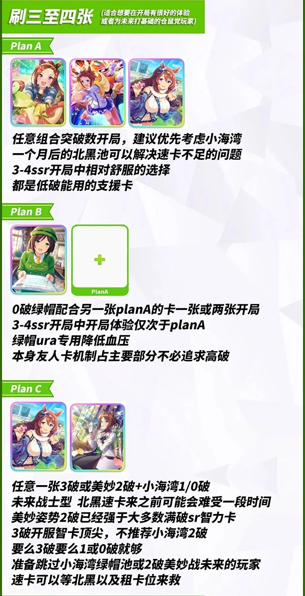 这张图针对不同类型的赛马娘玩家整理了开局刷初始的建议,内容比较详细,大家可以根据自己的需求标签快速定位到对应的部分。如果是计划使用北黑进行转生的玩家,不需要参考这篇开局准备的内容。刷初始时不建议只保留太少的卡片,推荐至少准备3张起步卡;由于常驻池的角色高破难度较大,不是重氪玩家或者没有补井计划的话,可以考虑选择多张低破卡片,但要注意低破可能会影响前期强度,需要根据自身情况权衡选择。