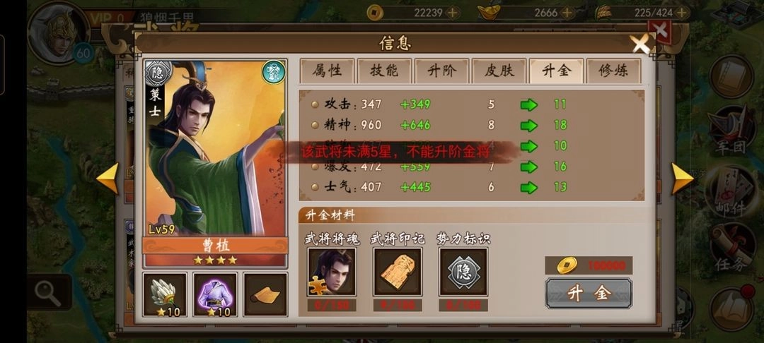 当特定武将达到五星后,消耗规定的材料就能进行升金操作,这不仅会改变武将的外观形象,还能大幅提升其属性成长值。(请注意哪些武将开放了升金功能)