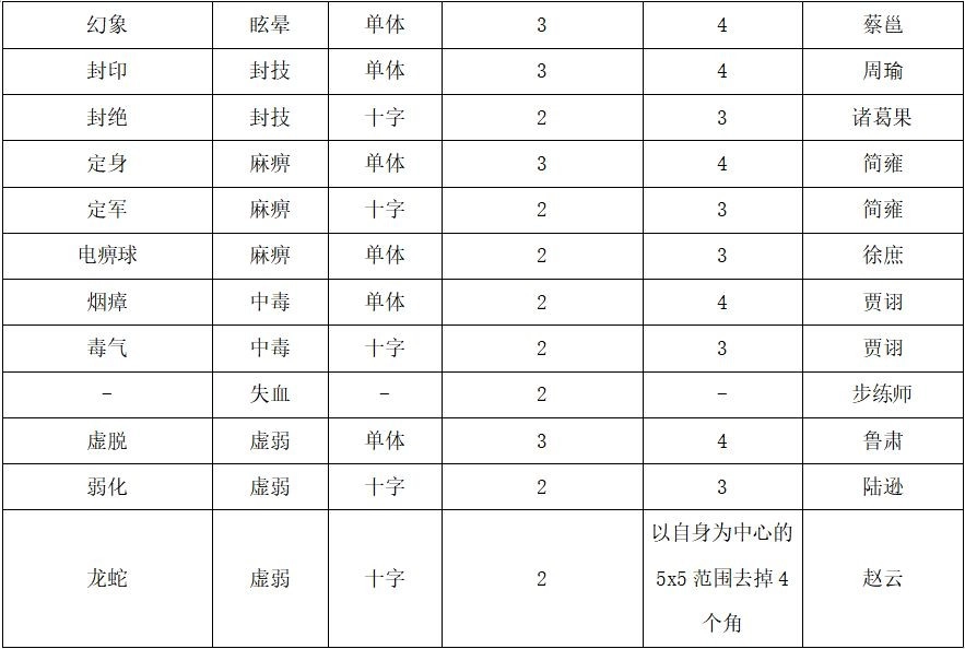 虚弱状态的特殊性在于,它主要在我军阶段生效以提升对目标的输出能力,而其他状态多在敌军阶段发挥作用,用于限制敌军行动或使其损失生命值。因此,表格中从敌军阶段视角描述虚弱的持续回合数并不准确,这只是为了统一表格格式才如此呈现;实际上,虚弱的作用时间应从“我军阶段”的角度来界定,其实际持续回合数可在表格现有数值基础上再加1回合。