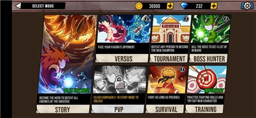 这里有不少玩法可供玩家前来尝试,像PVP模式、对战模式、故事模式、锦标赛模式、Boss猎人模式、训练模式等,其中部分需要观看广告。