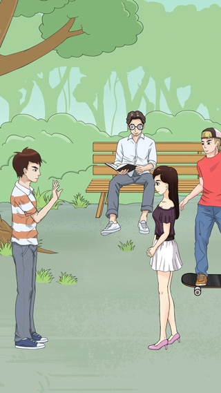 第一关:点击滑板男士的滑板,随后可以打开树丛里的眼镜,制造一个巧妙的误会。
