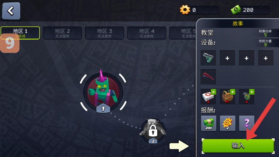 在区域选择界面,点击【输入】按钮,即可进入对应区域(例如教堂)的战斗任务。