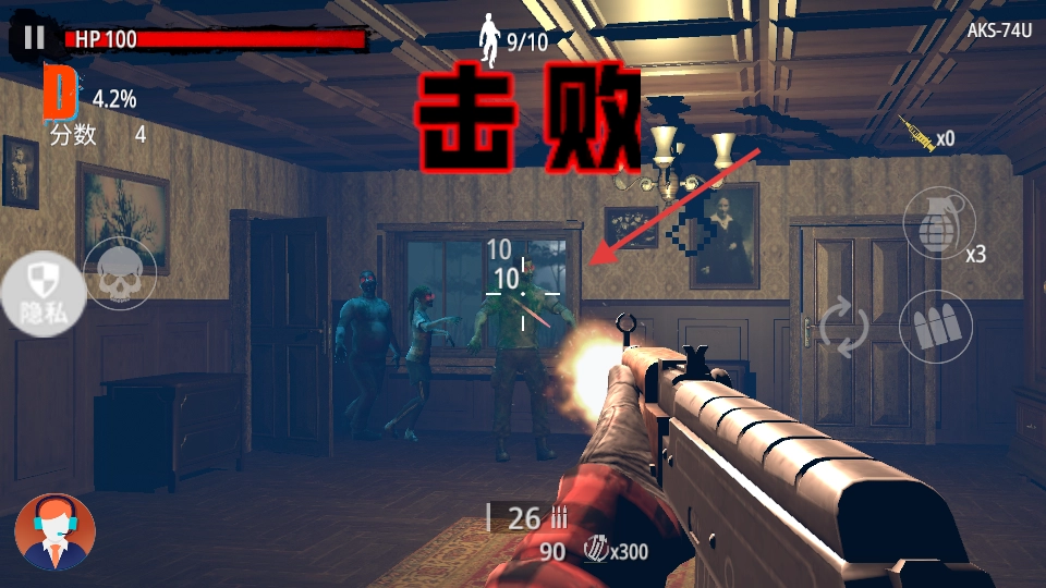 对准僵尸进行射击,利用AKS-7U快速歼灭它们,留意HP【100】的状态,通过积累分数来提高评级。