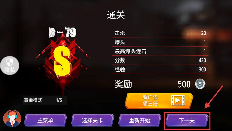 通过【D-79】关卡后点击【下一关】按钮,能观看广告领取三倍奖励,提升火力后继续挑战。