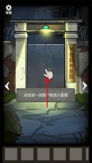 在医院门口的场景里,点击大门所在的区域,试着进入医院内部,这样就能开启精神病院的探索任务,从而推动游戏剧情的发展。