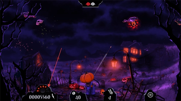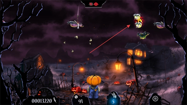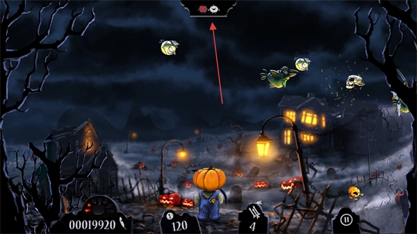 你将操控一个南瓜头角色,对准空中那些僵尸鸟、骷髅之类的敌人发射武器,只要击中它们就能获得分数。