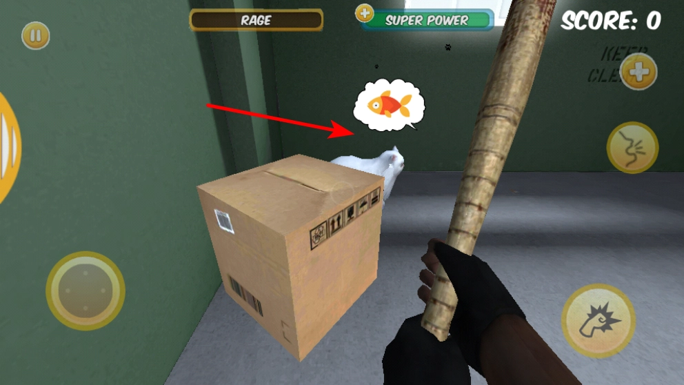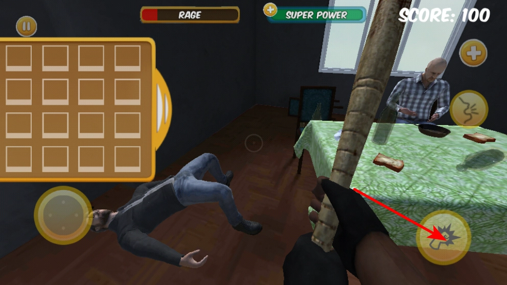 攻击目标角色,使用球棒击打场景里的人物,通过造成伤害来增加分数与狂暴值,从而推动游戏的进度。