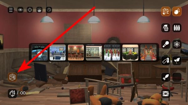 在场景里,右侧会出现手雷、炸弹之类的各种破坏道具,点击挑选对应的道具后,对准房间里的酒柜、桌椅这类物品,使用道具来完成爆破粉碎操作。
