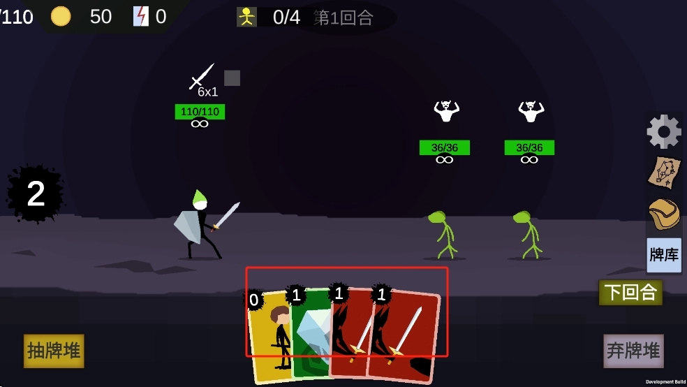 观察手牌区四张卡牌,选取红色攻击卡,点击后瞄准敌方左侧绿色小怪,释放技能发起首轮攻击。