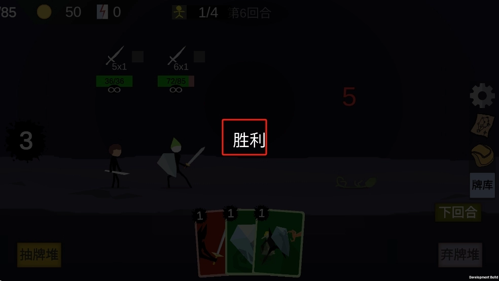 后续回合策略搭配卡牌,借攻击、增益操作逐步歼灭敌方单位,待敌方全灭,屏幕浮现胜利,达成关卡结算。