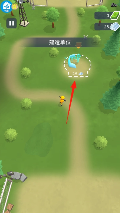 在建造单位阶段,点击红箭头指向的建造圈,消耗钻石,建造防御或攻击单位,布置在路径,准备抵御敌人。