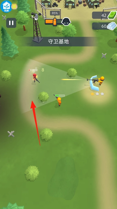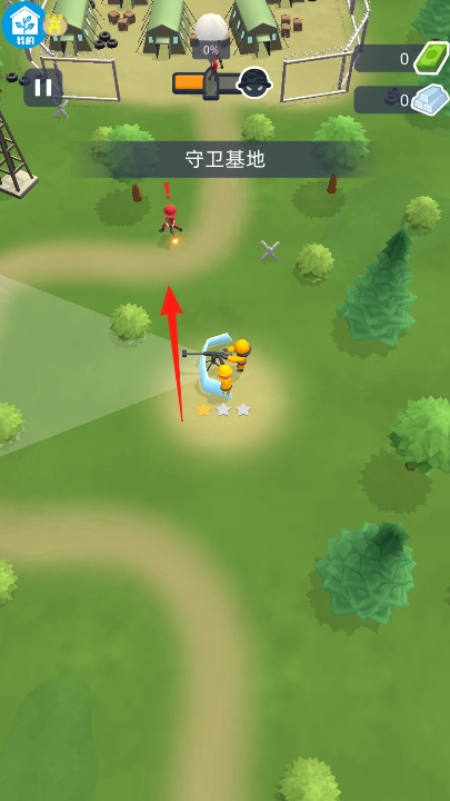进入守卫基地,操控黄色士兵,沿红箭头方向,拦截来袭敌人,利用已造单位,配合士兵攻击,阻止敌人靠近基地。