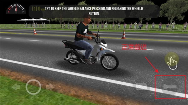 屏幕右侧的第一个动作是摩托车车头抬起,若将此动作与驾驶操作同时按下,就能完成车头翘起前进的特技动作。
