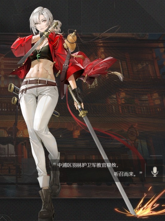 在“羽林护卫军”里,有一位手持唐刀、英姿飒爽的女教官。她的战斗风格一贯干脆利落、简单直接,正如同她直爽明快的性格。工作之余,星牧对养生也很有研究,腰间总是带着一壶温热的养生茶,并且还擅长推拿按摩。