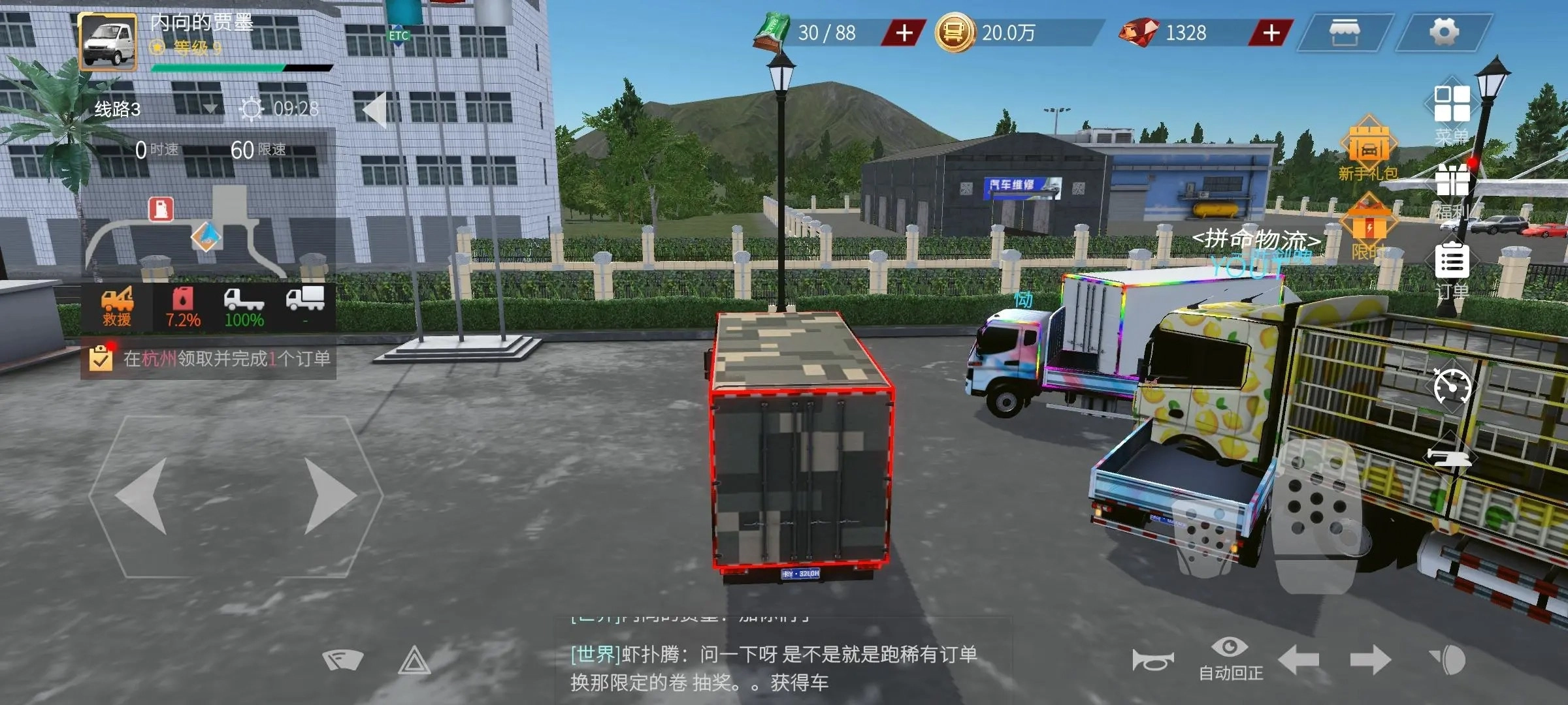进入游戏后,点击右侧的订单进行接收并完成任务。游戏操作十分简单:右侧按钮用于控制加速与减速,左侧可调整方向,此外还能借助右下角的小眼睛图标实现自动回正功能。